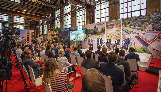 Eine zweite Gesprächsrunde widmete sich der Entwicklung von Wohnquartieren am Beispiel der ökologischen Mustersiedlung im Prinz-Eugen-Park in München. Hier kamen die verantwortliche Stadtbaudirektorin Ulrike Klar, der Staatssekretär des Bauministeriums NRW Dr. Jan Heinisch und der Direktor des Verbands der Wohnungs- und Immobilienwirtschaft NRW Alexander Rychter zusammen. Mit 570 Wohnungen ist die Siedlung Deutschlands größtes zusammenhängendes Holzbauquartier. Die Münchner Stadtverwaltung verfolgt konsequent die Etablierung des Holzbaus zusammen mit Klimaschutz und nachhaltiger Stadtentwicklung. Dafür knüpft sie geschickt die Vergabe von Grundstücken an ökologische und soziale Ziele. Die beiden Diskussionsvertreter von NRW sahen für ein solches Vorgehen großes Potenzial im bevölkerungsreichsten Bundesland, verwiesen auf bereits erfolgte Anpassungen im Bauordnungsrecht sowie die Möglichkeit, im Zuge der Wohnraumförderung seit 2020 ein Zusatzdarlehen für das Bauen mit Holz in Anspruch nehmen zu können. Allein gemessen an München steht eine Landeshauptstadt wie Düsseldorf dennoch erst am Anfang solch zukunftsweisender Prozesse wie in Bayern.