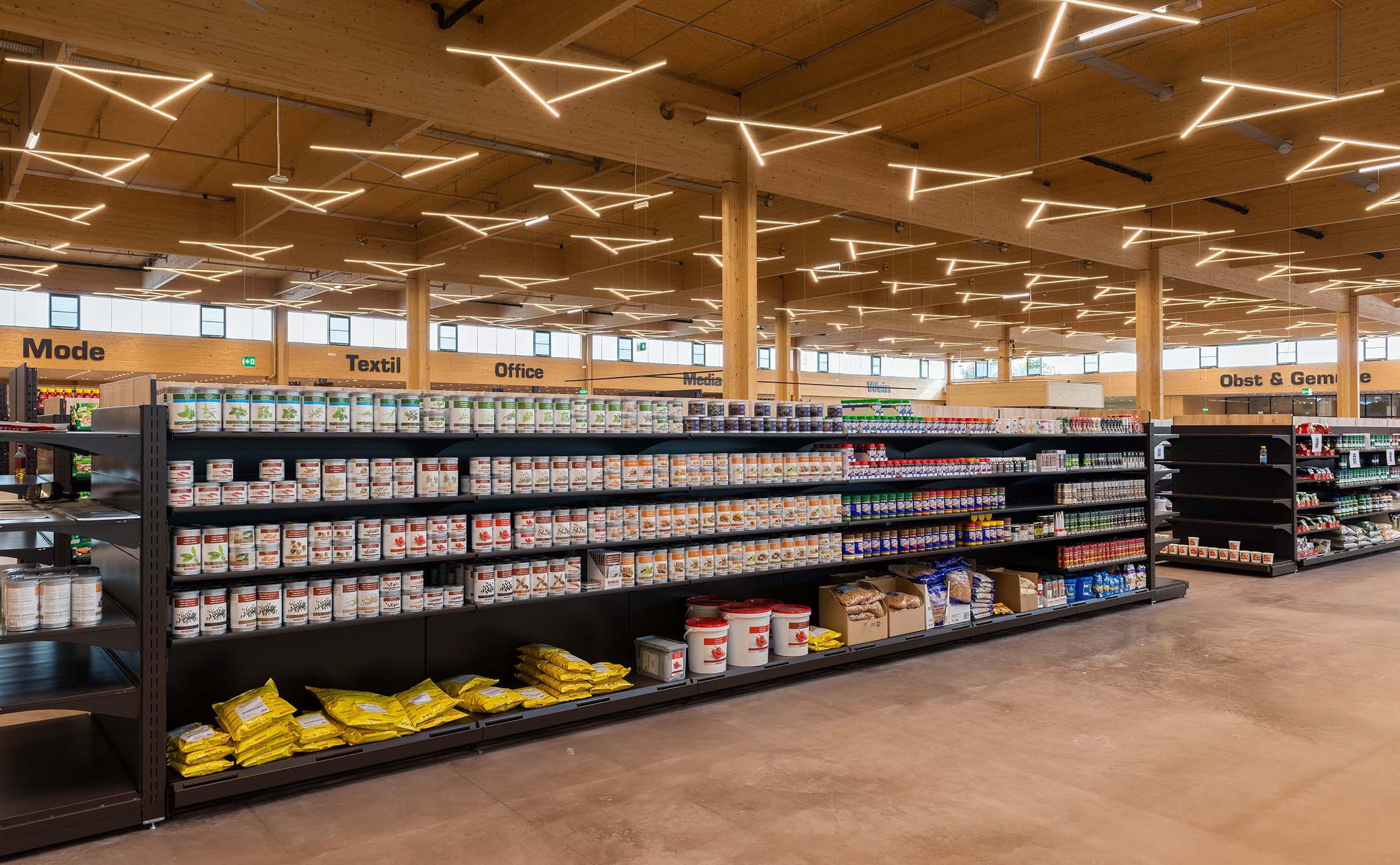 Ein nachhaltiges Gebäude wirkt sich auch positiv auf das Image des Unternehmens und das Kundenverhalten aus. Wer in angenehmer, thermisch behaglicher Atmosphäre zwischen den Regalen umherstreift, verweilt länger und steigert den Umsatz. Der hohe Vorfertigungsgrad der Holzbauelemente garantiert Präzision, mindert Fehlerquellen und ermöglicht sehr kurze Bauzeiten. Moderne Hochleistungsbaustoffe aus Holz, wie CLT (Cross Laminated Timber) oder BSH (Brettschichtholz) ermöglichen schlanke Aufbauten technisch komplexer und statisch hoch belastbarer Konstruktionen. Auch große Spannweiten mit wenigen Stützen sind mühelos realisierbar. Hat das Gebäude seine Lebensdauer erreicht, kann es schnell und problemlos rückgebaut werden. Auch eine Nutzungsänderung ist ohne großen Aufwand realisierbar. Die serielle Produktion ermöglicht die beliebige Vervielfältigung des Bauwerks, um neue Standorte zu entwickeln.
