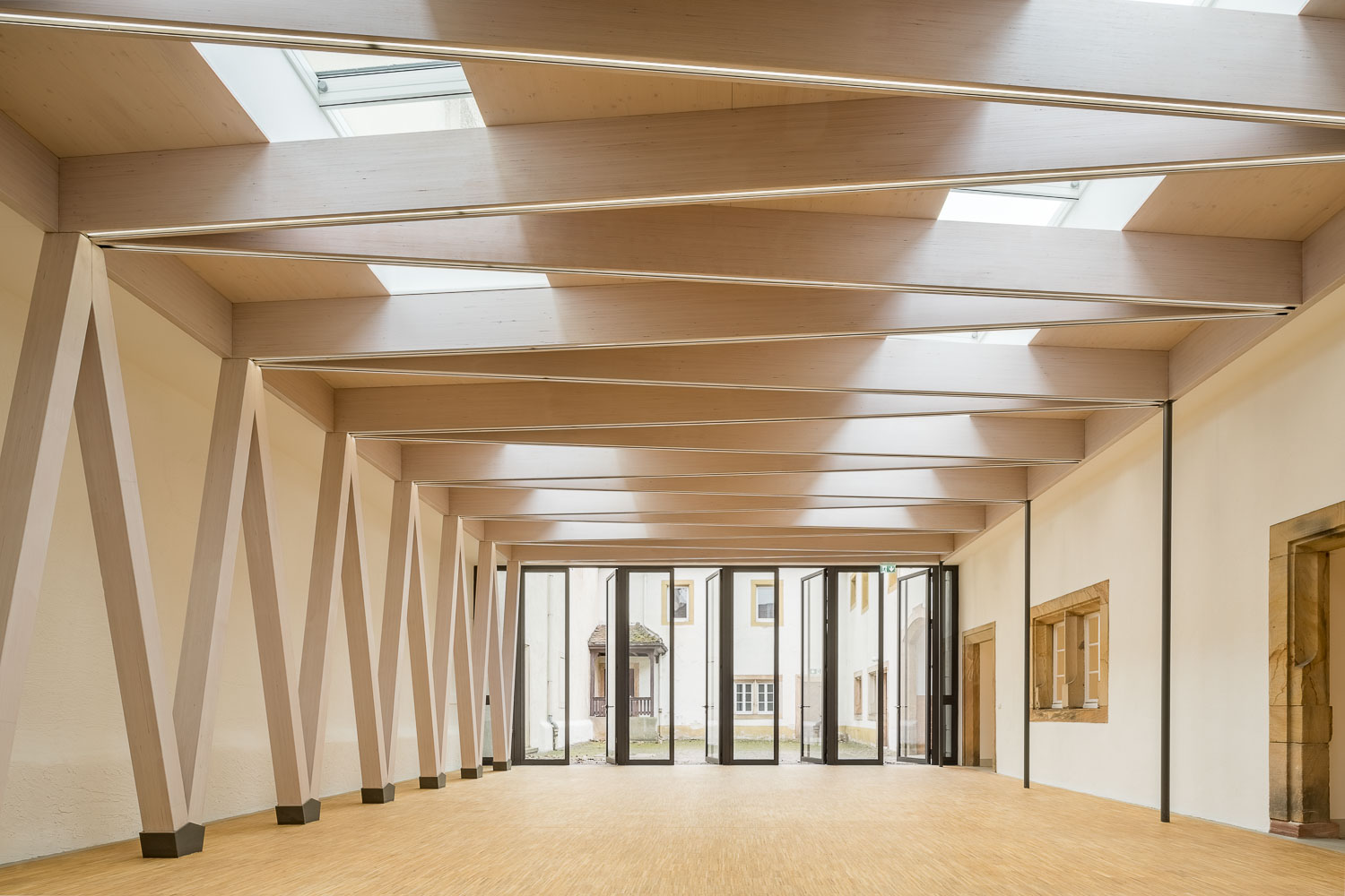 Ein Neubau für Versammlungen und Feste nimmt seit Sommer 2017 einen Großteil des Innenhofes des mittelalterlichen Schlosses von Bad Bergzabern ein. Die Ökumenische Sozialstation Annweiler hat ihn mit einem filigranen Tragwerk aus Buchenfurnierschichtholz realisiert. Eingepasst zwischen die Schlossmauern ergänzt der moderne Anbau die alte Bausubstanz dezent und doch mit neuem Schwung.