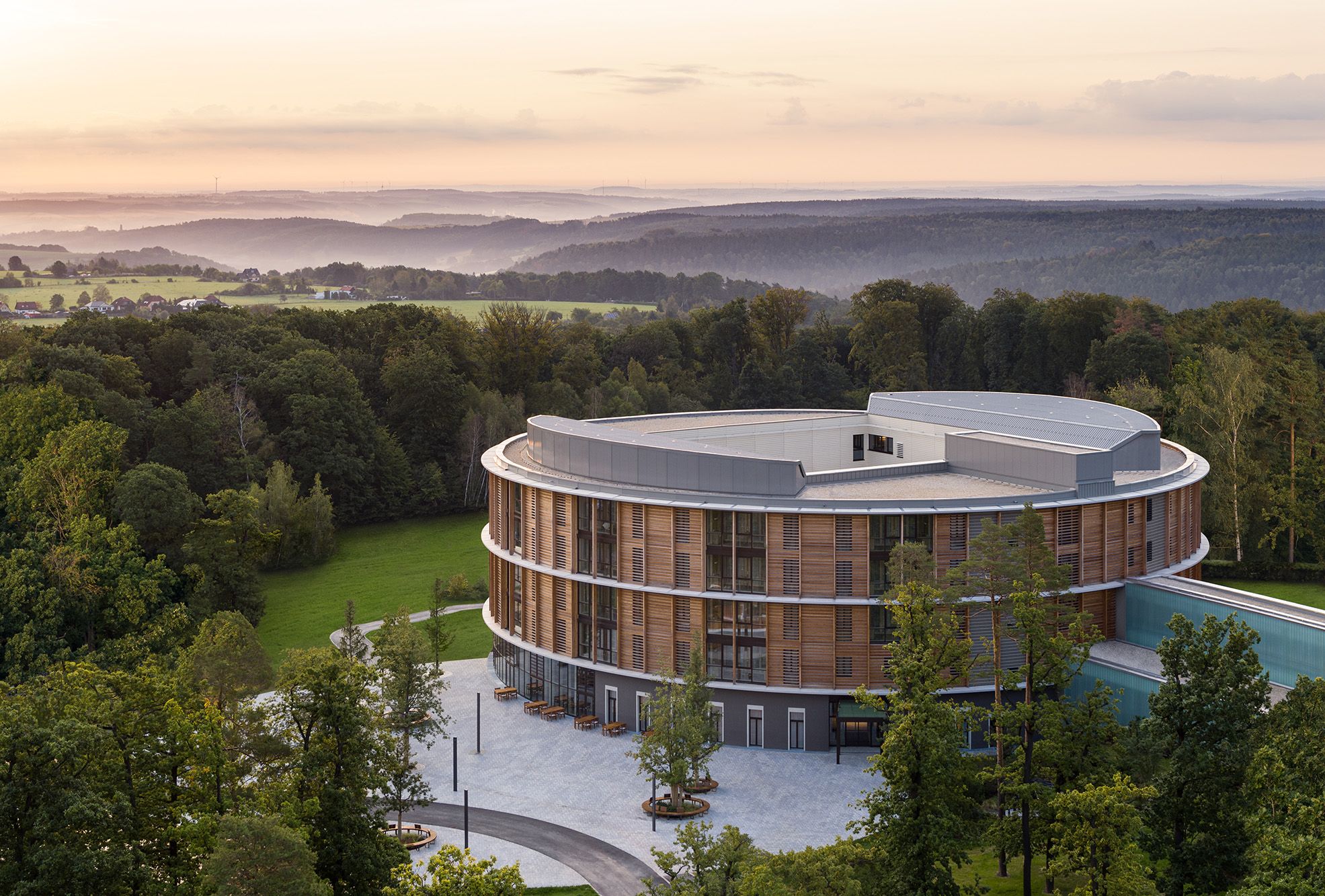 Das neue Bettenhaus der kommunalen Waldkliniken Eisenberg fügt sich mit seiner Holzfassade perfekt in den Thüringer Wald ein. Das neuartige Raumkonzept und die allgegenwärtigen Holzoberflächen unterstützen den Heilungsprozess und sorgen für eine Atmosphäre wie im Sternehotel.
