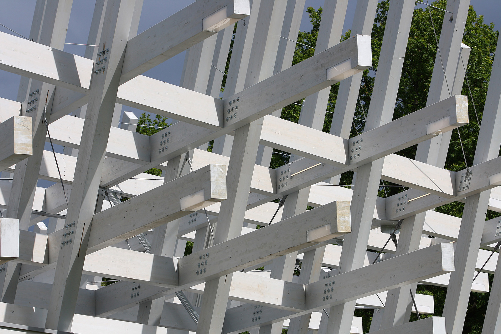 Die Konstruktion mit 98 unterschiedlich geneigten Stützen und einer Gitterstruktur aus 72 horizontalen Trägern wurde aus rund 338 m³ Brettschichtholz (Fichte) errichtet und unter dem Einsatz von