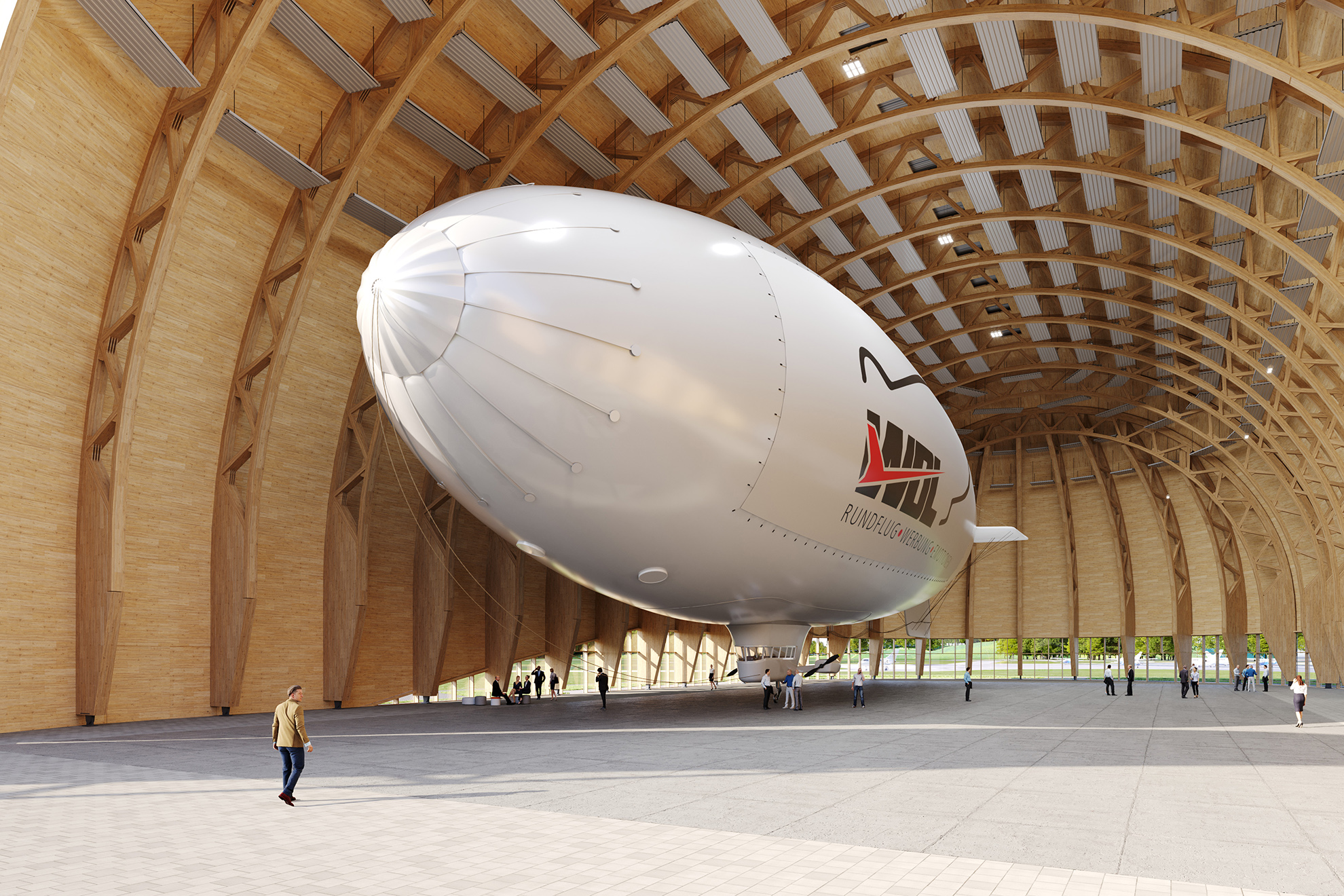 Die Kubatur des neuen Hangars orientiert sich an der bestehenden Halle und entsteht eins zu eins auf dem Fußabdruck des Bestandsgebäudes, es erfolgt also keine weitere Flächenversiegelung. Die runde Formgebung weckt Assoziationen an das Luftschiff „Theo“, so als ob dieses soeben auf dem Boden gelandet ist. Dabei legt sich die Aluminiumfassade wie ein Tuch über die hölzerne Tragkonstruktion. Auch hier haben sich die Beteiligten bewusst gegen ein Plane, wie bisher im Bestand genutzt, und für eine recyclingfähige Aluminiumfassade entschieden.