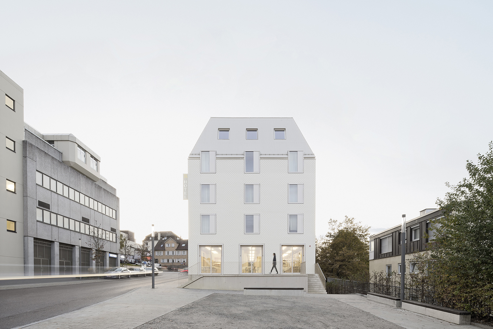 Das Hotel Bergamo fällt erst auf den zweiten Blick als Holzbau auf. Die Fassade aus weißen Faserzementplatten und die fassadenbündigen Fenster verleihen ihm ein ebenso schlichtes wie elegantes Aussehen, verraten aber nichts von der warmen Ausstrahlung des Gebäudeinneren. Eine der Vorgaben der Stadt bestand in der Verwendung von Holz. Ziel des Entwurfs war zudem, Akzente in architektonischer, bautechnischer und ökologischer Hinsicht zu setzen. Dabei spielte die maximale Reduzierung des CO2-Ausstoßes sowohl bei der Errichtung als auch im Betrieb eine entscheidende Rolle.