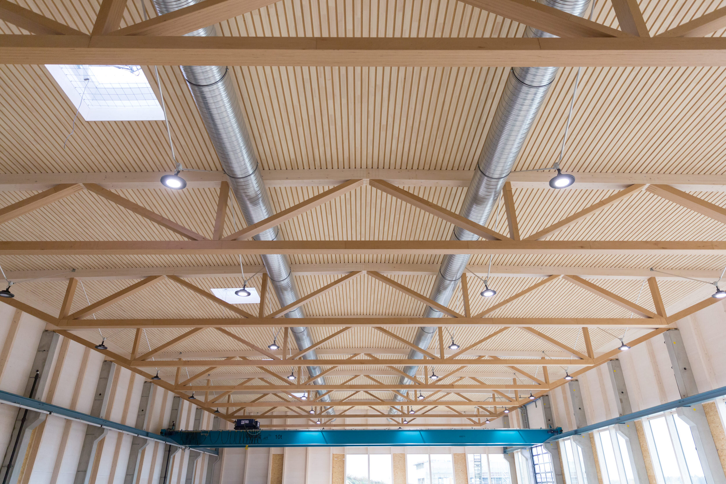 Für die hohen Ansprüche an Nachhaltigkeit, Wirtschaftlichkeit und Design setzten die Bauherren auf einen Holzbau. Dessen Bauteile sollten allerdings trotz geforderter Feuerwiderstandsdauer von 30 Minuten möglichst filigran ausfallen. Um die Halle mit Holz zu überspannen, boten Fachwerkträger hier eine ebenso elegante wie materialeffiziente Lösung. Die Planer nutzten dafür – mit Ausnahme des Obergurts – hochtragfähiges Buchen-Furnierschichtholz (Buchen-FSH, auch BauBuche), das sowohl schlanke Querschnitte als auch eine Feuerwiderstandsklasse von R30 ermöglichte.