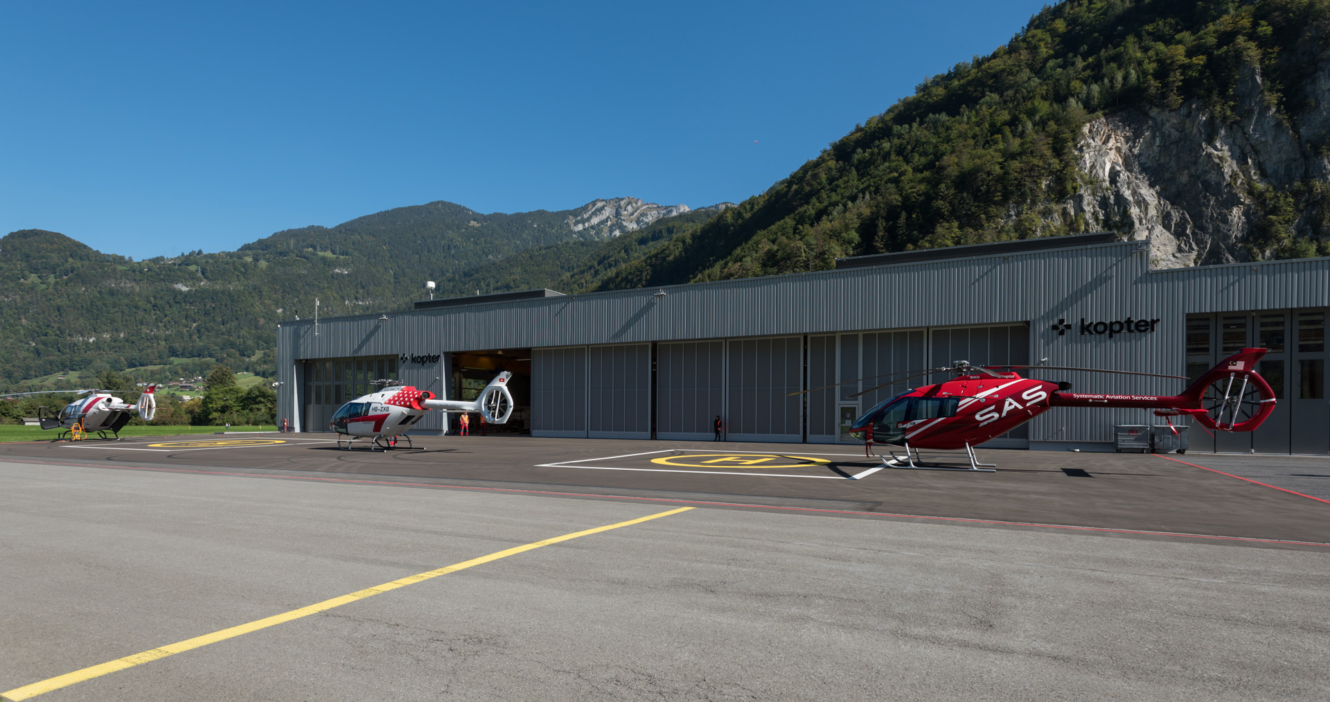 Die Kopter Group AG, ehemals Marenco Swisshelicopter AG, aus Mollis in der Schweiz benötigte eine Fertigungshalle für die Montage ihrer Helikopter. Dafür zog die Bauherrin zunächst Stahl in Betracht. Dank der Überzeugungsarbeit des Architekten und des Holzbau-Unternehmers fiel die Entscheidung dann aber zugunsten einer Halle in Holzbauweise mit weitgespannten Fachwerkträgern aus Buchen-Furnierschichtholz.