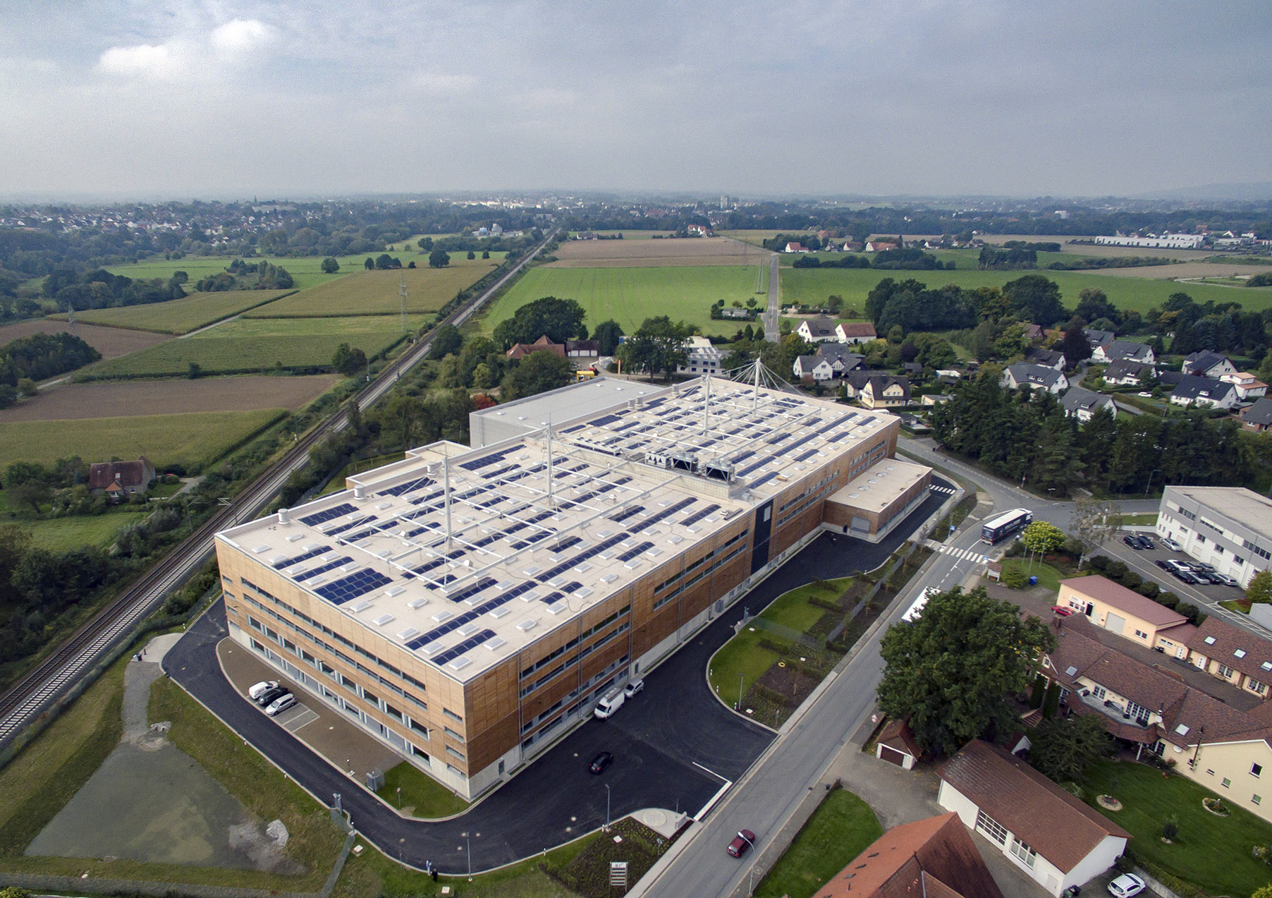 In Ostwestfalen entstand ein Produktionsstandort eines Herstellers für Möbelbeschläge. Die Architekten mussten sehr sorgsam mit der Ressource Baugrund umgehen. Daher konzipierten sie übereinander liegende Räume. Das oberste Geschoss wurde in Holzbauweise errichtet.