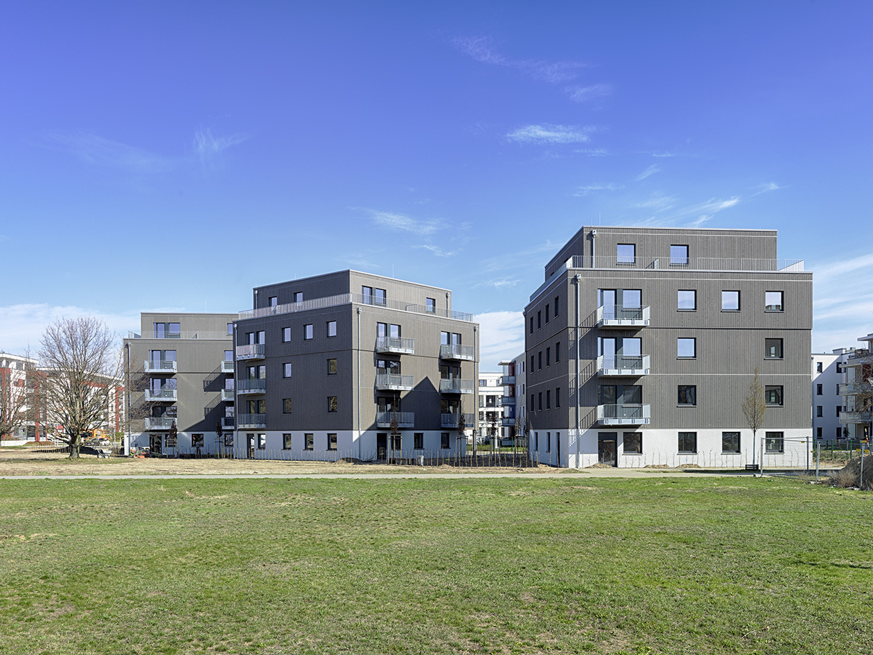 Auf dem 2.825 Quadratmeter großen Grundstück im Quartier „Wohnen am Campus“ in Berlin-Adlershof befinden sich die würfelförmigen Punkthäuser mit einem jeweiligen Außenmaß von 16,2 x 16,2 Metern. Auf der Wohnfläche von 2.730 Quadratmetern verteilen sich 42 Wohneinheiten mit Ein- bis Vierzimmerwohnungen und 5 Etagen, die barrierefrei erreichbar sind. Fast alle Wohnungen verfügen über einen Balkon oder eine Terrasse. 40 Prozent der Wohnungen sind förderfähig und werden zu Einstiegsmieten von 6,50 Euro pro Quadratmeter angeboten. Die übrigen Wohnungen liegen im Durchschnitt unter zehn Euro pro Quadratmeter. Dass diese Mietpreise trotz der geringen Wohnungsanzahl abbildbar sind, ist u.a. dem Einsatz des Baustoffs Holz zu verdanken:
